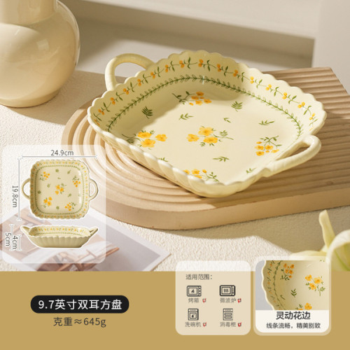 The French Pastoral Style Ceramic Square Plate is a beautifully crafted tableware piece designed for both household and restaurant use. Featuring a floral motif with scalloped edges, it blends artistry with practicality.