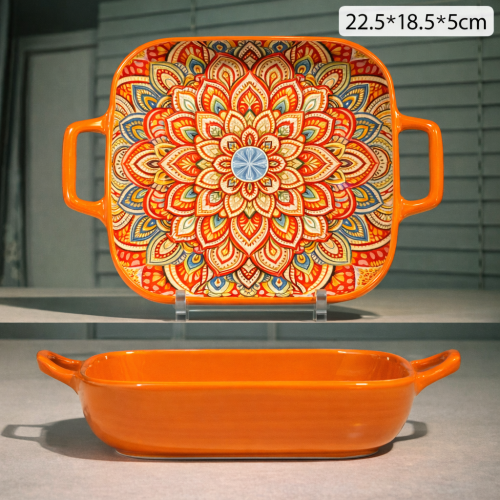 Measuring 22.5 cm × 18.5 cm × 5 cm, this plate is ideal for serving pasta, salads, baked dishes, or festive meals. Its dual-handle design adds convenience and charm, making it suitable for both casual dining and decorative serving.
