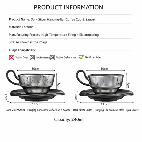 The Ceramic Hanging Ear Coffee Cup & Saucer Set is a stylish and high-end tableware piece designed for accessible luxury. Featuring a Morris butterfly motif in dark silver, it blends artistry with practicality.