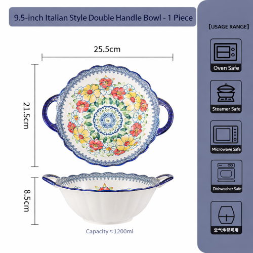 Measuring 9.5 inches (25.5 cm × 21.5 cm × 8.5 cm) and holding approximately 1200 ml, this bowl is perfect for serving soups, noodles, stews, or pasta. Crafted from premium porcelain with an underglaze finish, it is durable, heat-resistant, and safe for use in microwaves, ovens, steamers, air fryers, and disinfection cabinets.
