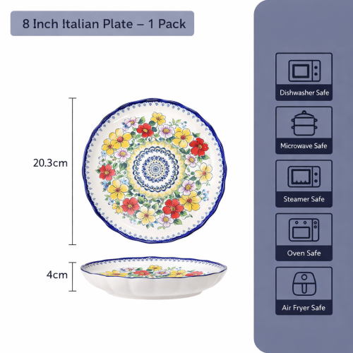 Measuring 20.3 cm × 4 cm, this plate is ideal for serving snacks, desserts, salads, or festive meals. Crafted from premium porcelain with an underglaze finish, it is durable, smooth, and resistant to fading.