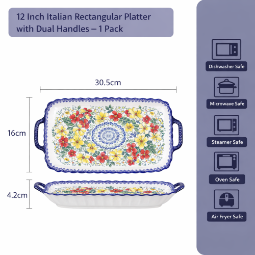 Measuring 30.5 cm × 16 cm × 4.2 cm, this plate is ideal for serving pasta, baked dishes, salads, or festive meals. Crafted from premium porcelain with an underglaze finish, it is durable, smooth, and resistant to fading.