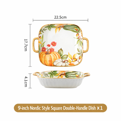 The Nordic Pumpkin Ceramic Dual-Handle Square Dish is a versatile and stylish piece of tableware designed for both household and restaurant use. Featuring a pastoral-style pumpkin and floral motif, it blends artistry with practicality.
