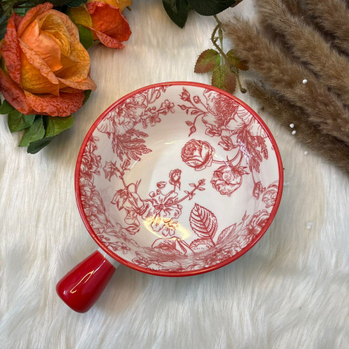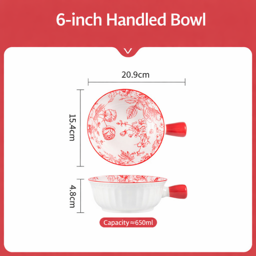 The Rose Queen Ceramic Handled Bowl is part of the Queen of Roses series, designed with festive motifs that symbolize good luck and happiness. Crafted from premium porcelain using underglaze color technology, the bowl is durable, smooth, and resistant to fading.
